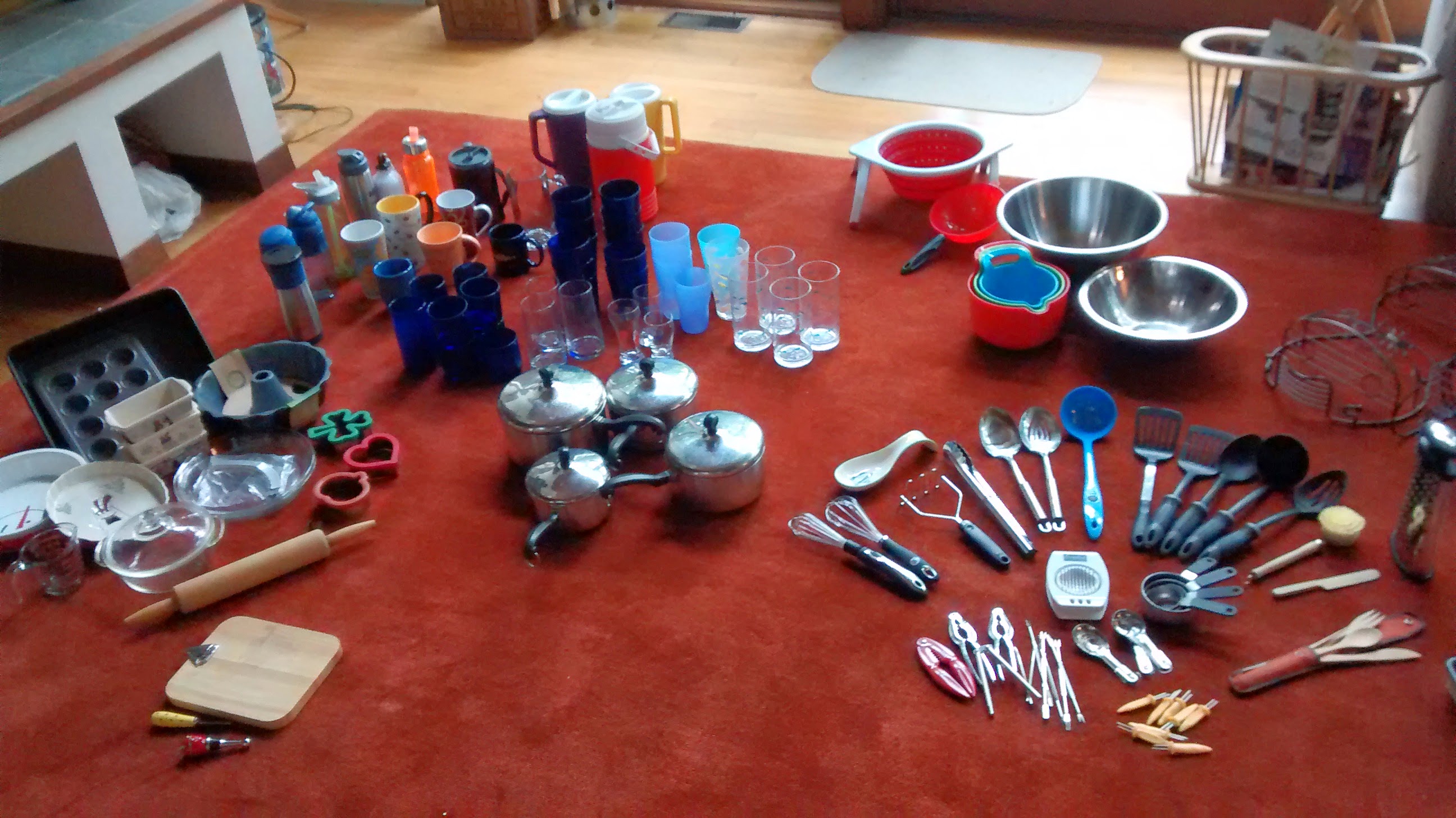 Plenty of kitchen utensils, baking wares, cups, bowls, crock pot, coffee maker, electric hot water maker, toaster oven, popcorn maker, microwave, table lamps, pixma printer/scanner/copier, baskets, vases, seasonal decorations, area rugs, picture frames, fish tanks, shower hangers, and womens size 8 and 9 shoes