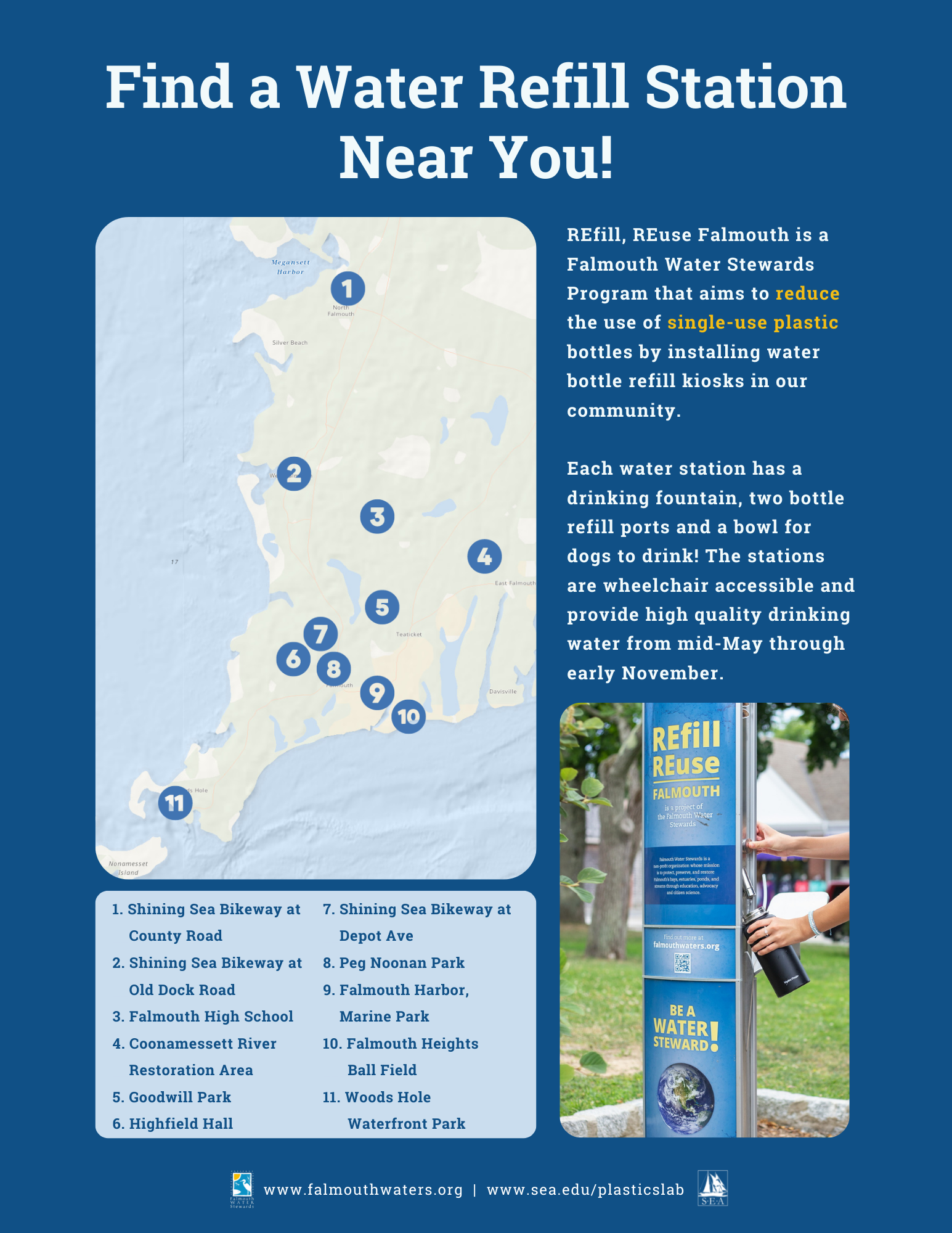 REfill REuse Falmouth is a program that aims to reduce single-use plastic consumption across Falmouth. The Water Stewards have installed these water stations to encourage people to refill their own water bottles instead of buying single use plastic bottles. In addition to the existing stations, a twelfth is being installed at Highfield Hall soon, and eventually they’ll be found at several beaches across Falmouth. Attached to this email is a map of all of their locations for your reference.
