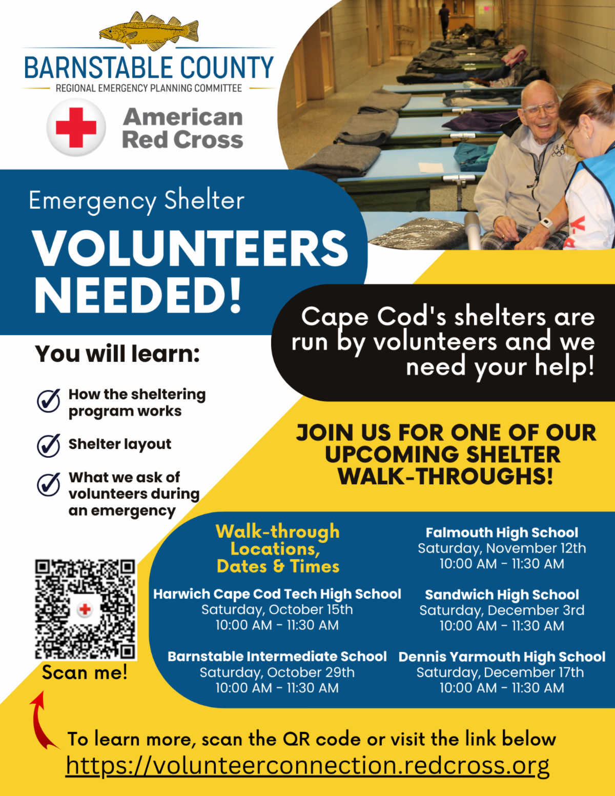 With the growing threat of more severe and frequent storms, more people rely on the Red Cross and Cape Cod's regional emergency shelters for a warm, safe, and dry place of refuge during storms. The shelters are run by people like you, who register for the Red Cross and participate in a four-hour online training to become valuable team members in an emergency.