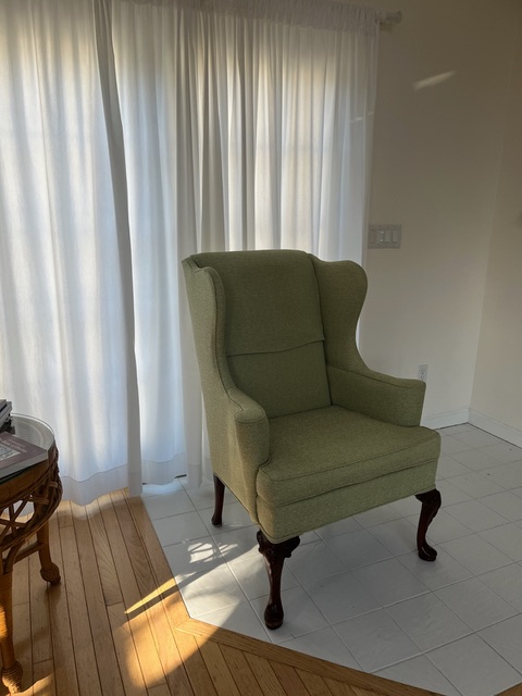 One - light green, fully upholstered wing back arm chair. Very good condition, free to a good (or bad) home.