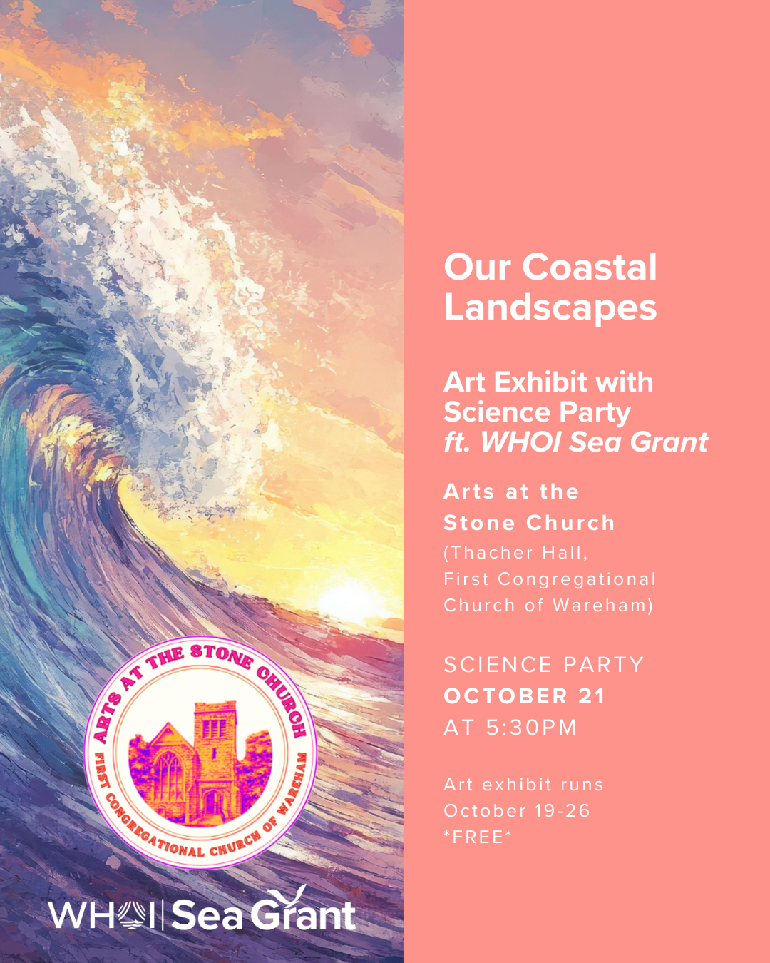 Join WHOI Sea Grant for a "Science Party” Oct 21, at 5:30pm as part of “Our Coastal Landscapes” Art Exhibit. An Arts at the Stone Church and WHOI collaboration, the exhibit celebrates the diverse beauty of our coastal environments, wildlife, and the vessels people use to navigate on the water. Local artists and WHOI scientist-artists will display their creative work at the First Congregational Church of Wareham (11 Gibbs Ave) from Oct 19-26. Families, friends, and curious minds are invited to the "Science Party" to explore interactive exhibits, meet local artists and scientists, and participate in creative activities designed to spark imagination and foster a love for learning more about the land where the land meets the water. The science of coastal resilience and aquaculture will compliment artistic reflections on the beauty and challenges of the coastline.
