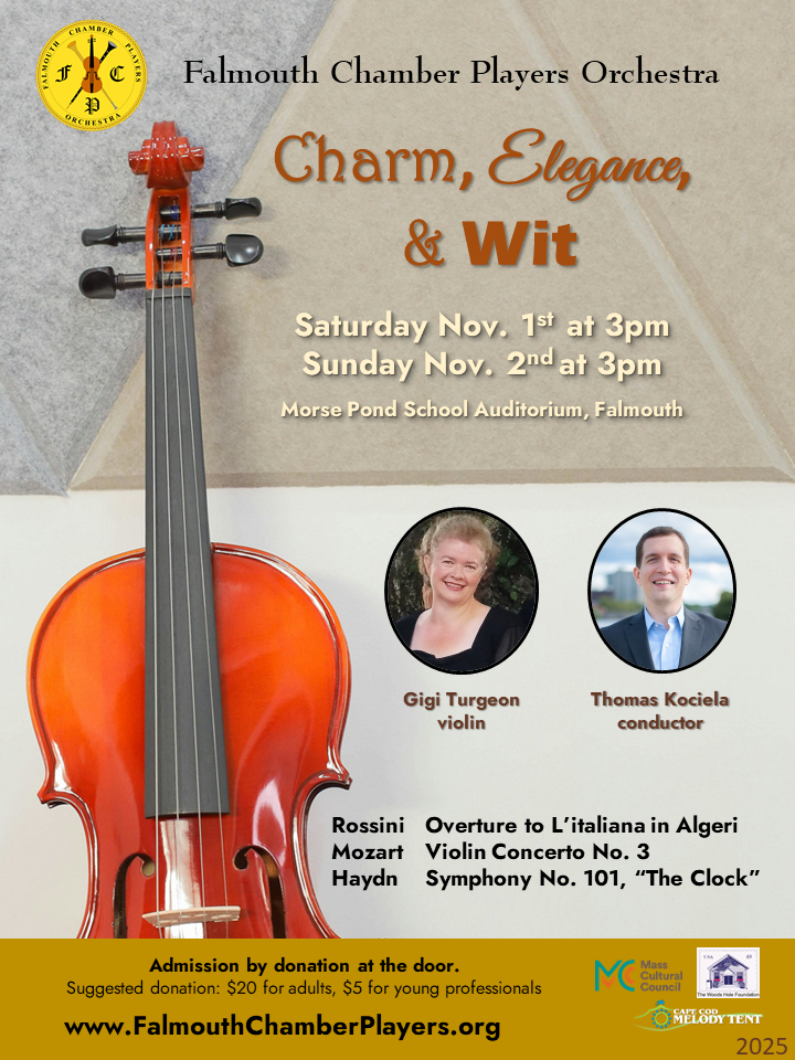 Join the Falmouth Chamber Players Orchestra for our fall concert, "Charm, Elegance, and Wit", featuring violinist Gigi Turgeon.