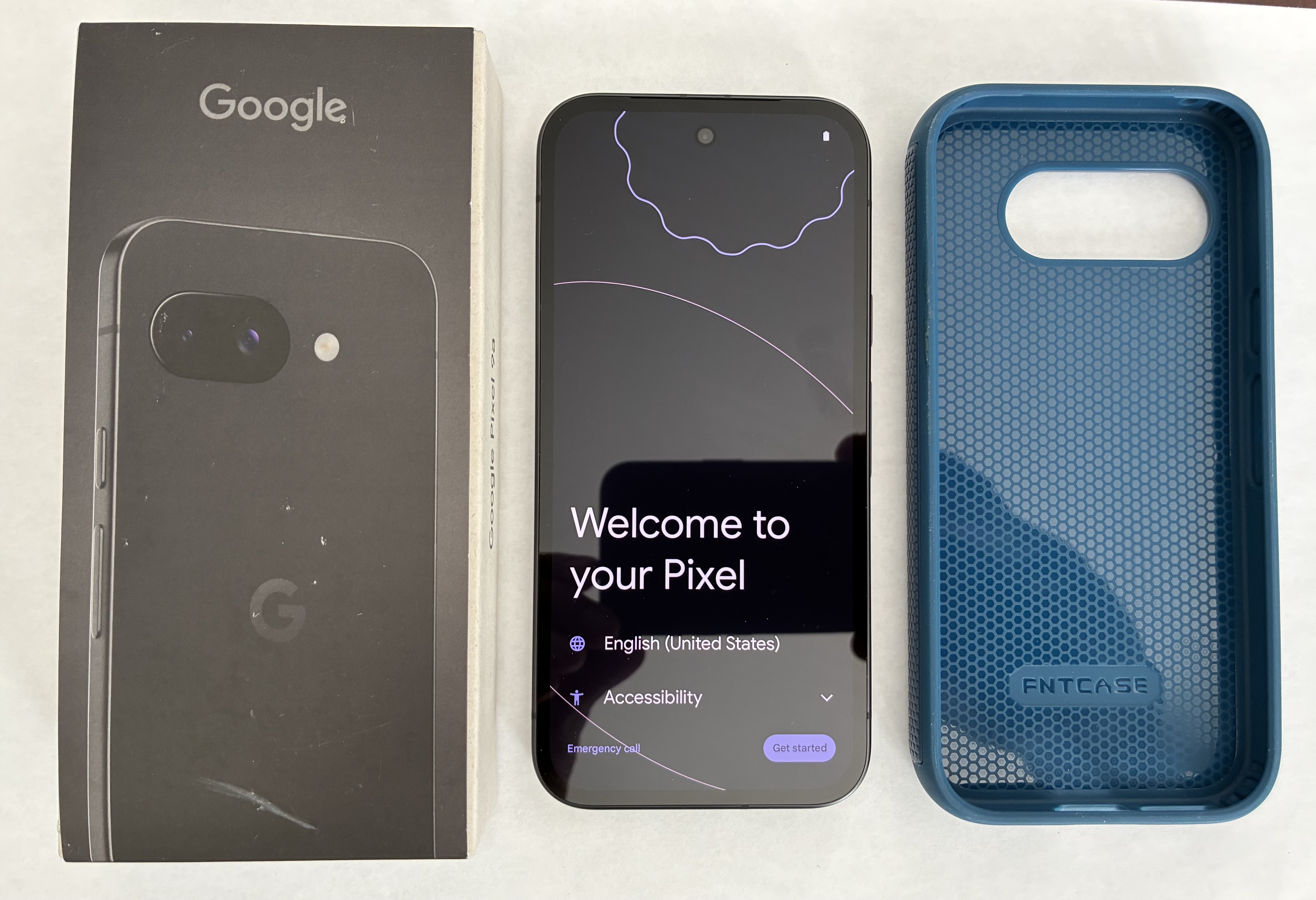 Google Pixel 9a, 128GB, Obsidian. Unlocked (can be used on any network); has been factory reset. Includes original box and blue case.