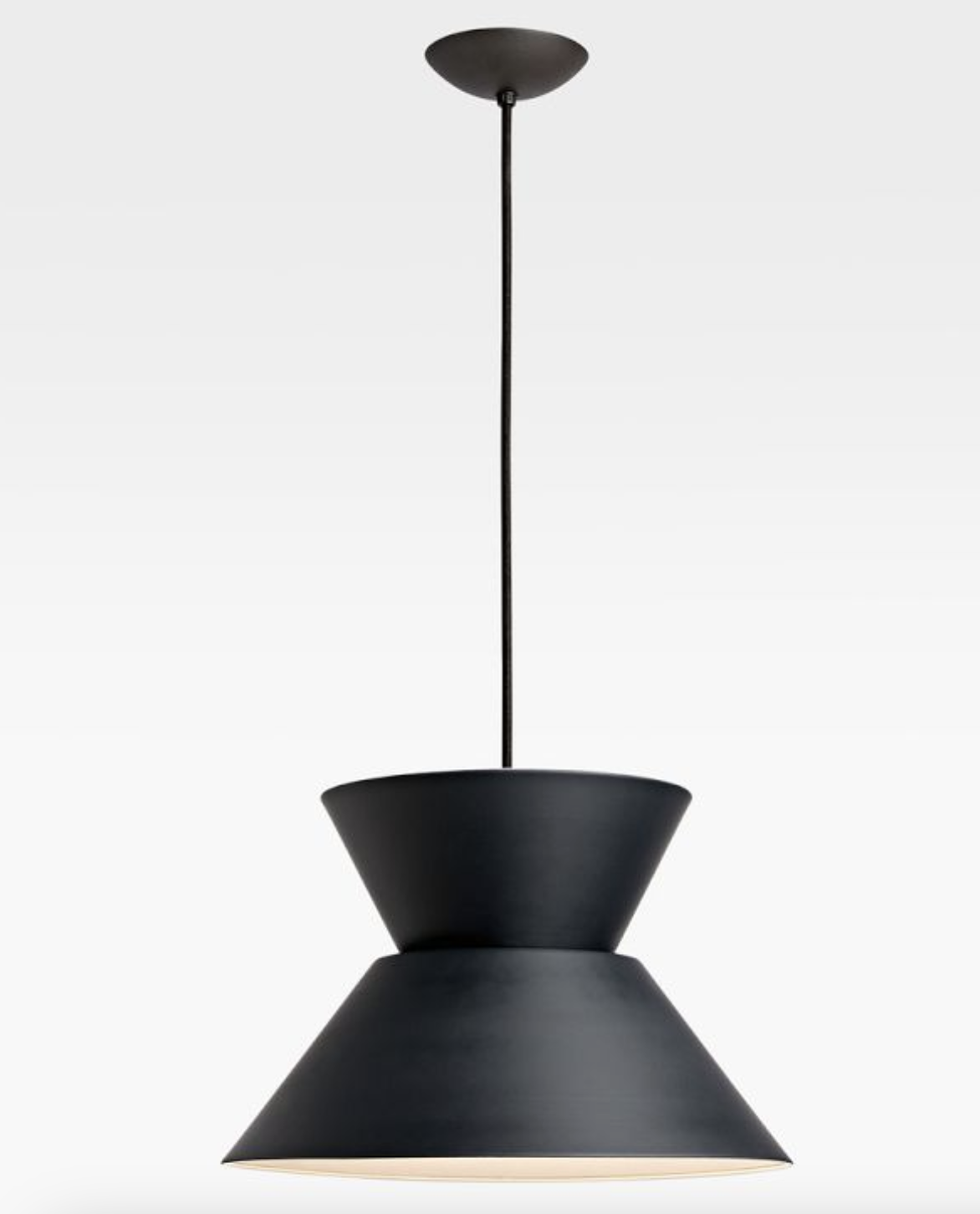 Pendant Light - Anello 18" Spun core pendant light from Rejuvenations. Matt black exterior with white interior powder coat. 30" overall length. Ordered incorrect size for space. In box, bulb not included. Original cost $499 plus tax. See link for full specs. https://www.rejuvenation.com/products/anello-18-pendant/ - Asking $200
